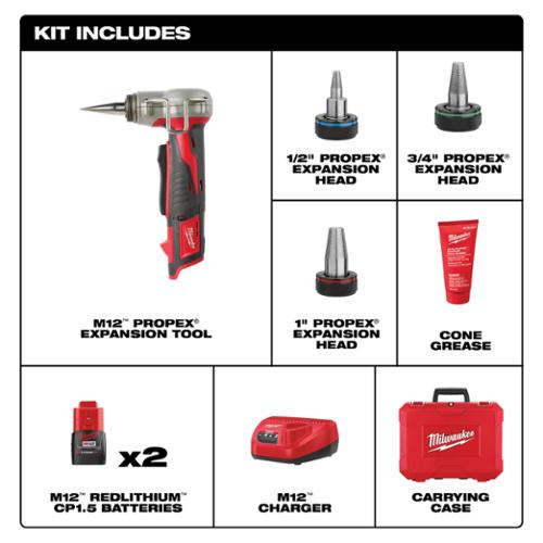• Includes: (1) M12™ Cordless ProPEX® Expansion Tool, (1) 1" ProPEX® Expansion Head, (1) 3/4" ProPEX Expansion Head, (1) 1/2" ProPEX® Expansion Head, (1) ProPEX® Expander Cone Grease, (1) M12™ Lithium-Ion Battery Charger, (2) M12™ Redlithium™ Battery, (1) Carrying Case