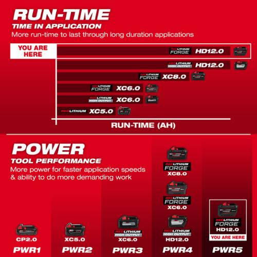 'The M18™ Redlithium™ Forge™ HD12.0 Battery Pack Delivers 50% More Power Than The High Output™ 12.0, High-Speed Cooling For Less Downtime In High-Demand Applications, 35-Minute Supercharge To 80%, And The Longest Life Vs Redlithium™ Batteries. Redlithium™ Forge™ Are Our Most Powerful, Fastest Charging, And Longest-Life Batteries. The M18™ Redlithium™ Forge™ HD12.0 Delivers 12 Amp Hours Of Runtime With 50% More Power Than The High Output™ 12.0, Providing Optimal Power And Runtime For Demanding Applications. The M18™ Redlithium™ Forge™ HD12.0 Is COOL-CYCLE™ Capable. COOL-CYCLE™ Active Cooling System Provides High-Speed Cooling For Less Downtime. Patented Ingress Coating Provides Increased Protection To Maximize Active Cooling Through An Upgraded Venting Design. The High-Speed Cooling Feature Works With M18™ Chargers That Have COOL-CYCLE™ Capability. When Paired With The M18™ Dual Bay Simultaneous Super Charger, This Battery Charges In Just 35 Minutes To 80% Getting You Back To Work Faster Than Ever Before.
