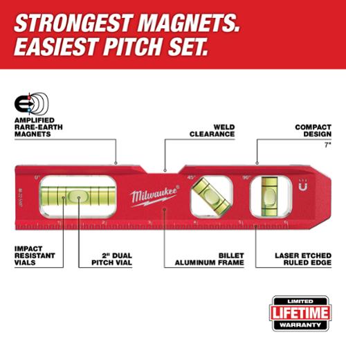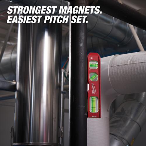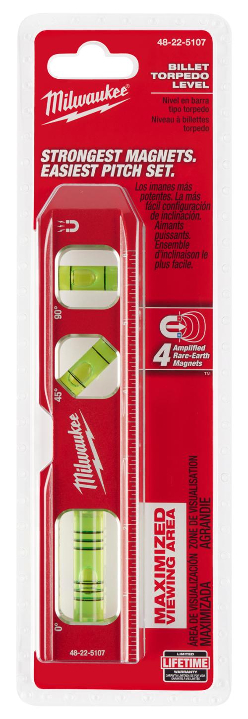 'The Milwaukee® Billet Torpedo Level Features 4 Amplified Rare Earth Magnets For Over 2x The Holding Power Of Leading Competitors. The 2" Long Dual Pitch Vial Is The Largest On The Market And Ensures That The User Can Make Fast And Accurate Readings Of 18 Inch And 14 " Per Foot In Any Position. The Optimized Top And Back Side Pipe Grooves Make This The Optimal Tool For Working With Both Small And Large Diameter Pipes. The Milwaukee® Billet Level Also Offers A Weld Clearance And Laser Etched Ruled Edge.