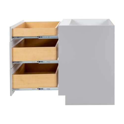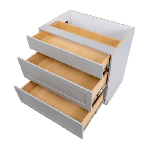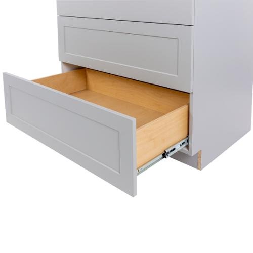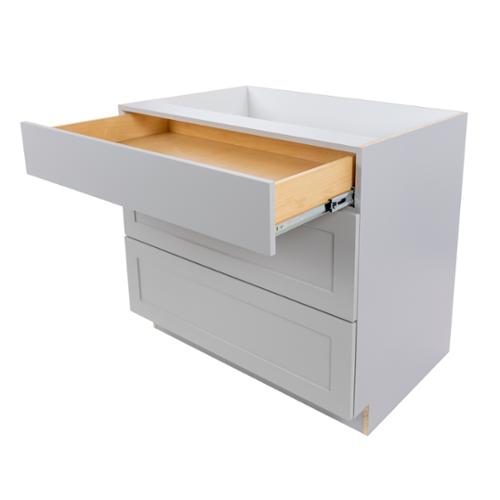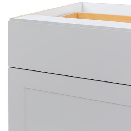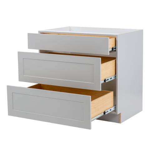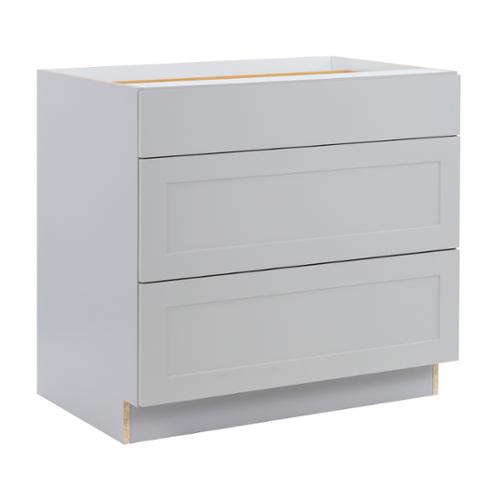 The Edson 36 in. W assembled base cabinet in Grey will withstand the test of time, and is beautifully crafted with a slab drawer front and 2 shaker style drawers. The Edson collections Grey color offers a taupe-Grey finish and laminated natural maple interior that is sure to produce a serene atmosphere. Including a full overlay style, the base cabinet is fully assembled making it easy for you to build the kitchen, bathroom, laundry room, or office of your dreams.