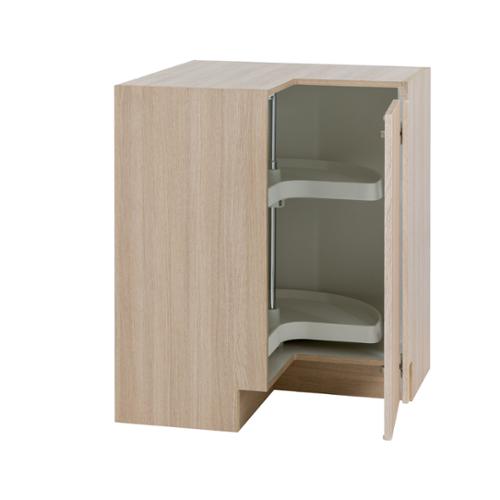 • Fully assembled 27.8-inch W x 34.5-inch H x 16.4-inch D lazy Susan corner kitchen cabinet in riverside sand with reversible door and finished left and right sides for easy installation anywhere in your cabinet run