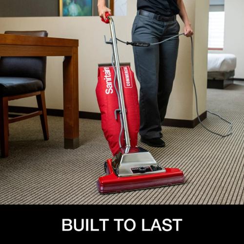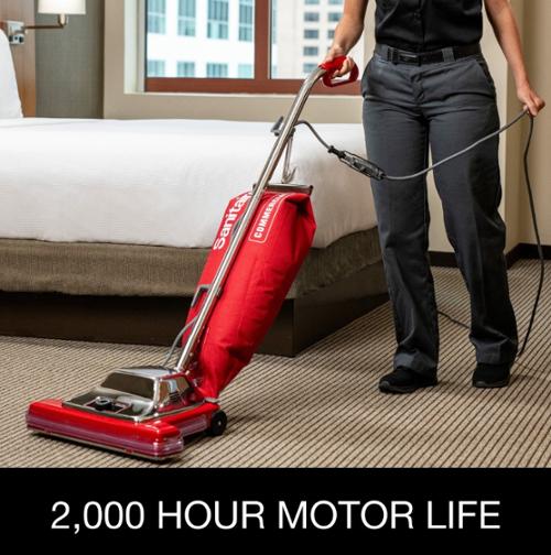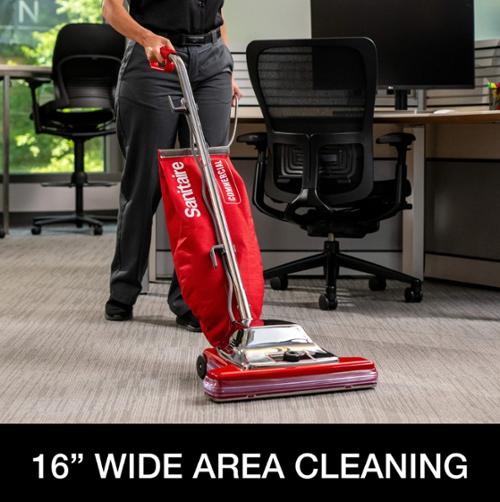 The TRADITION® Wide Track® Commercial Upright Vacuum has a 16” cleaning path for 33% more productivity. Commercial design with a chrome hood for added durability in the toughest environments. Lowers cost of ownership with a 2,000 hour motor, shake out bag and chrome brush roll with replaceable bristle strips. Quick Kleen™ fan chamber helps diagnose and clear clogs for easy maintenance. Increase productivity with less downtime with a large-capacity, 18-qt. shake out bag and 50-foot quick-change, pigtail cord. New model adds looped handle for added comfort and maneuverability and a pigtail cord for easier and cost-effective maintenance.