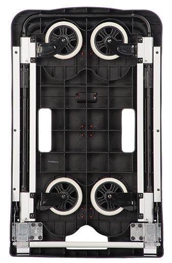 ▪ 300 Lb Capacity ▪ Four Wheels Folding Platform Truck ▪ Opens And Closes In Seconds, Folds Flat To Only 3.5" Thick For Easy Storage And Transportation ▪ Telescoping Handle Extends To 36" And The Tires Automatically Fold Out ▪ 27 X 16" Platform ▪ 4" Non Marring Solid Rubber Wheels