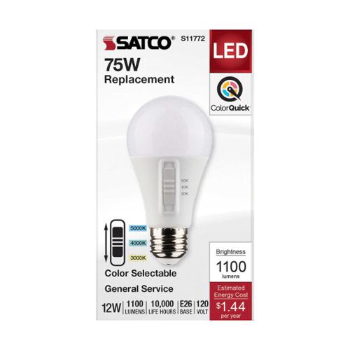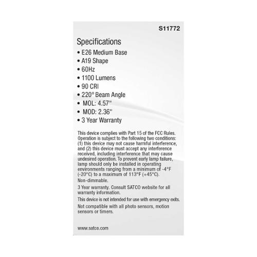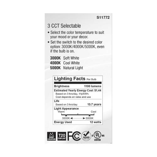 • White • 3CCT Colour Selectable 3,000K/4,000K/5,000K • 120 Volts • Medium Base • 10,000 Average Hour Life • 1,100 Lumens • 90 CRI • 220° Beam Angle • Non-Dimmable • Replaces 75W Incandescent Bulb • Damp Location Rated • Mfg #S11772