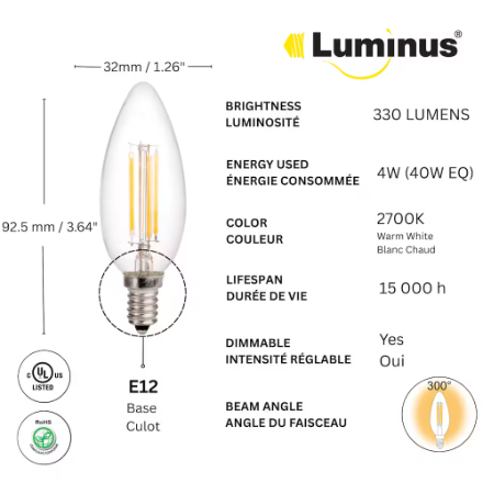 ▪ Candelabra Base▪ 2700 Kelvin▪ 25000 Average Hour Life▪ 315 Lumens