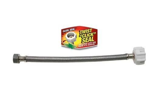 The Fluidmaster Click Seal Toilet Connector is designed to be the fastest and easiest to install toilet supply line on the market. Click Seal makes an audible click when the seal is secure, to help eliminate over-tightening and minimize cross threading and stripping.