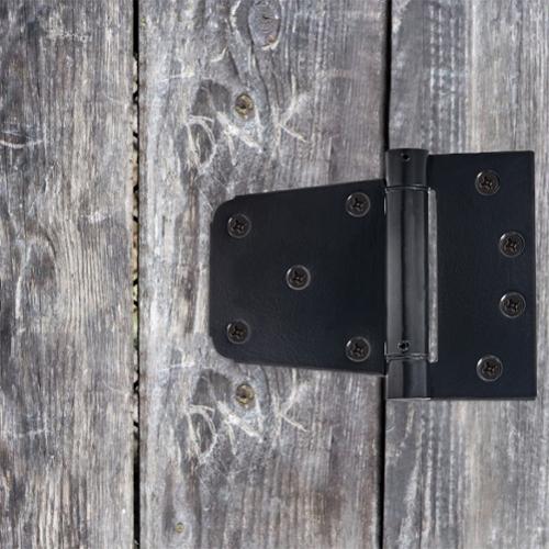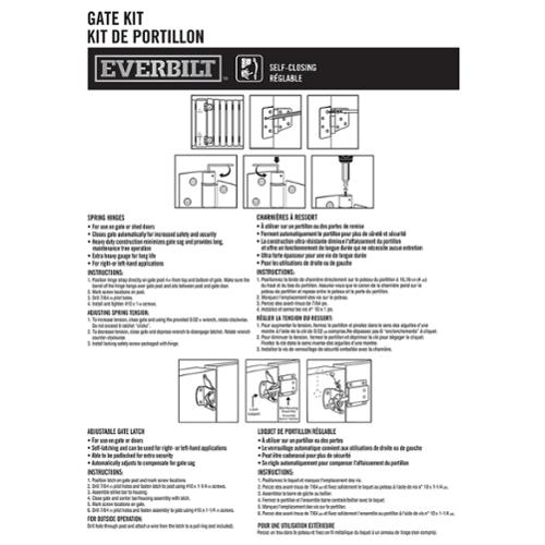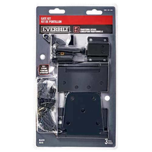 Everbilt's Traditional Gate Kit Self-Closing Gate Kit is ideal for outdoor gates, shed doors and barn doors. Kit includes spring t-hinges and a gate latch for inward- and outward-swinging gates and doors. Gate latch self-adjusts to compensate for ove 1/2-Inch of gate sag.
