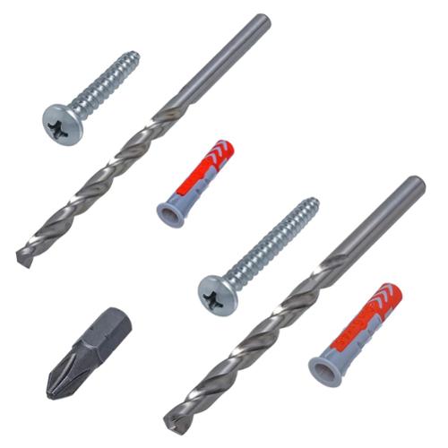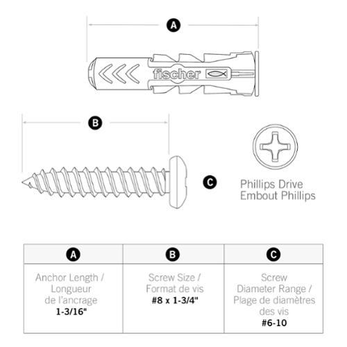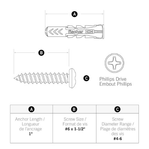 • Includes DuoPower #4-6 and #6-10 anchors, #6x1-1/2-Inch & #8x1-3/4-Inch screws, 3/16-in & 1/4-Inch drill bits, #2 Phillips driver bit