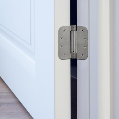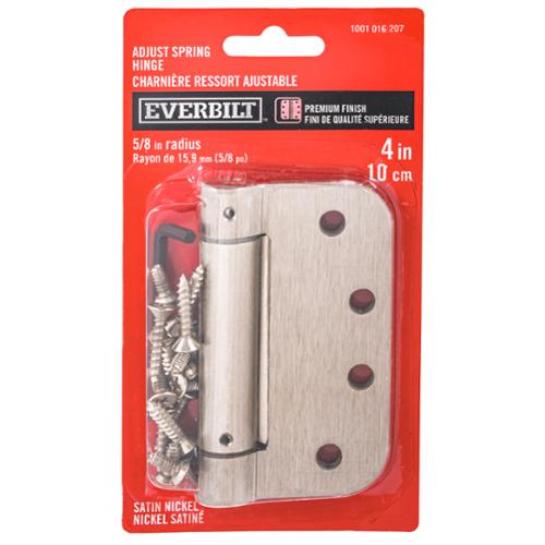'Everbilt's 4-in Adjustable Spring Door Hinge with 5/8-in Radius is ideal where a self-closing door is required. It is specifically for doors up to 3 feet by 7 feet. Finish works well with today's contemporary satin nickel hardware.