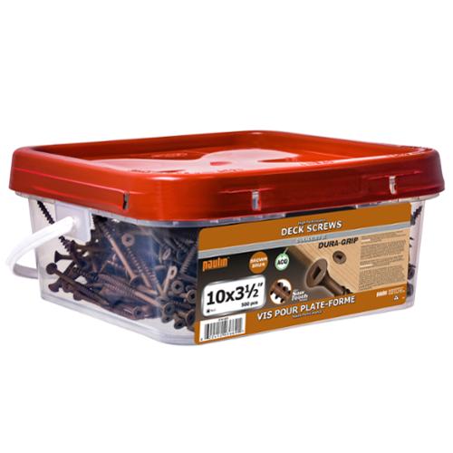 The Paulin brand deck screw is an exterior rated screw designed for wood to wood fastening. The specifically formulated coating is design to prevent rust, staining or streaking in all pressure treated wood. The DURA-GRIP square drive head improves drive torque performance and helps to avoid slipping. The Saw Tooth threads provides a faster driving screw while reducing wood splitting. An average of 4 to 6 screws are required per square foot when using a 2 x 6 or 5/4 x 6 wooden decking.
