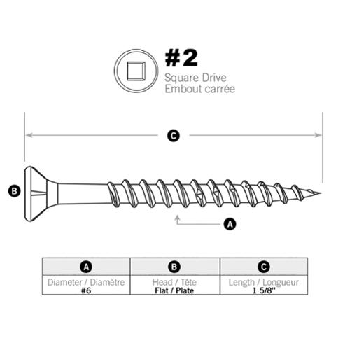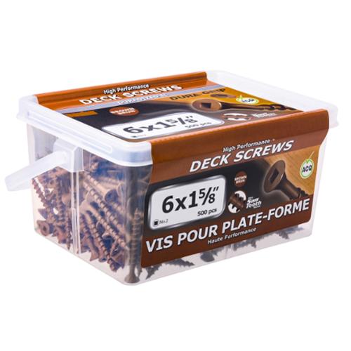 The Paulin brand deck screw is an exterior rated screw designed for wood to wood fastening. The specifically formulated coating is design to prevent rust, staining or streaking in all pressure treated wood. The DURA-GRIP square drive head improves drive torque performance and helps to avoid slipping. The Saw Tooth threads provides a faster driving screw while reducing wood splitting. An average of 4 to 6 screws are required per square foot when using a 2 x 6 or 5/4 x 6 wooden decking.