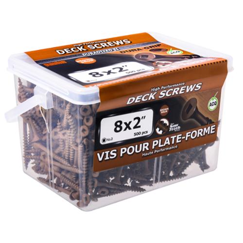 The Paulin brand deck screw is an exterior rated screw designed for wood to wood fastening. The specifically formulated coating is design to prevent rust, staining or streaking in all pressure treated wood. The DURA-GRIP square drive head improves drive torque performance and helps to avoid slipping. The Saw Tooth threads provides a faster driving screw while reducing wood splitting. An average of 4 to 6 screws are required per square foot when using a 2 x 6 or 5/4 x 6 wooden decking.