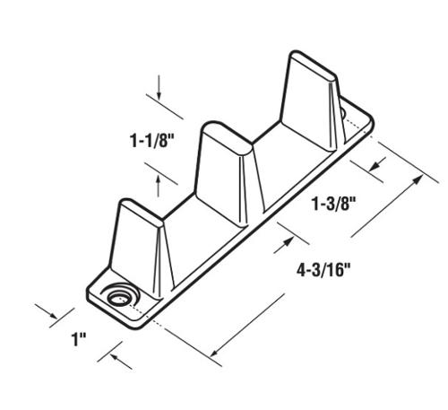 This sliding closet door bottom guide is constructed of plastic and white in color. These bottom guides feature a universal design, and they are able to accommodate 1-3/8 inch thick by-passing closet doors. The mounting holes of these floor guides are spaced apart at 4-3/16 inch from center to center, and they feature 1-1/8 inch tall fins. These bypassing sliding closet door bottom guides are easy to install and are used by a variety of closet door manufacturers.